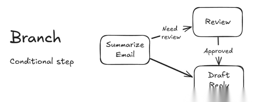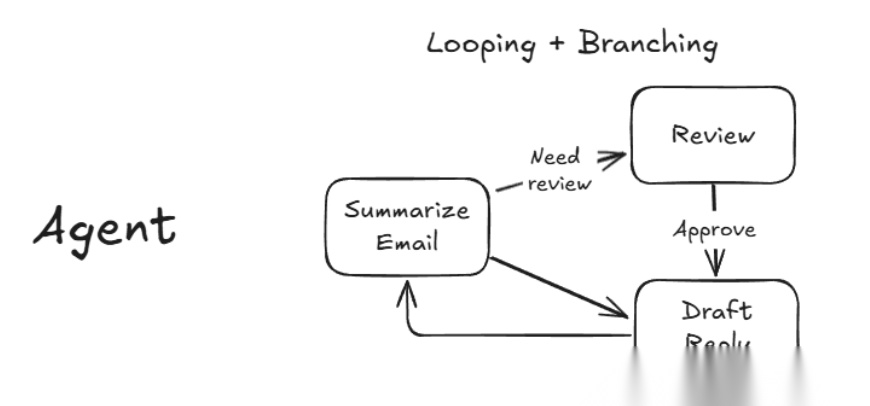 下图是一个**「总结邮件内容并生成回复」**的Agent,他会分析邮件内容、确定是否需要人工审核、草拟回复并不断迭代优化。