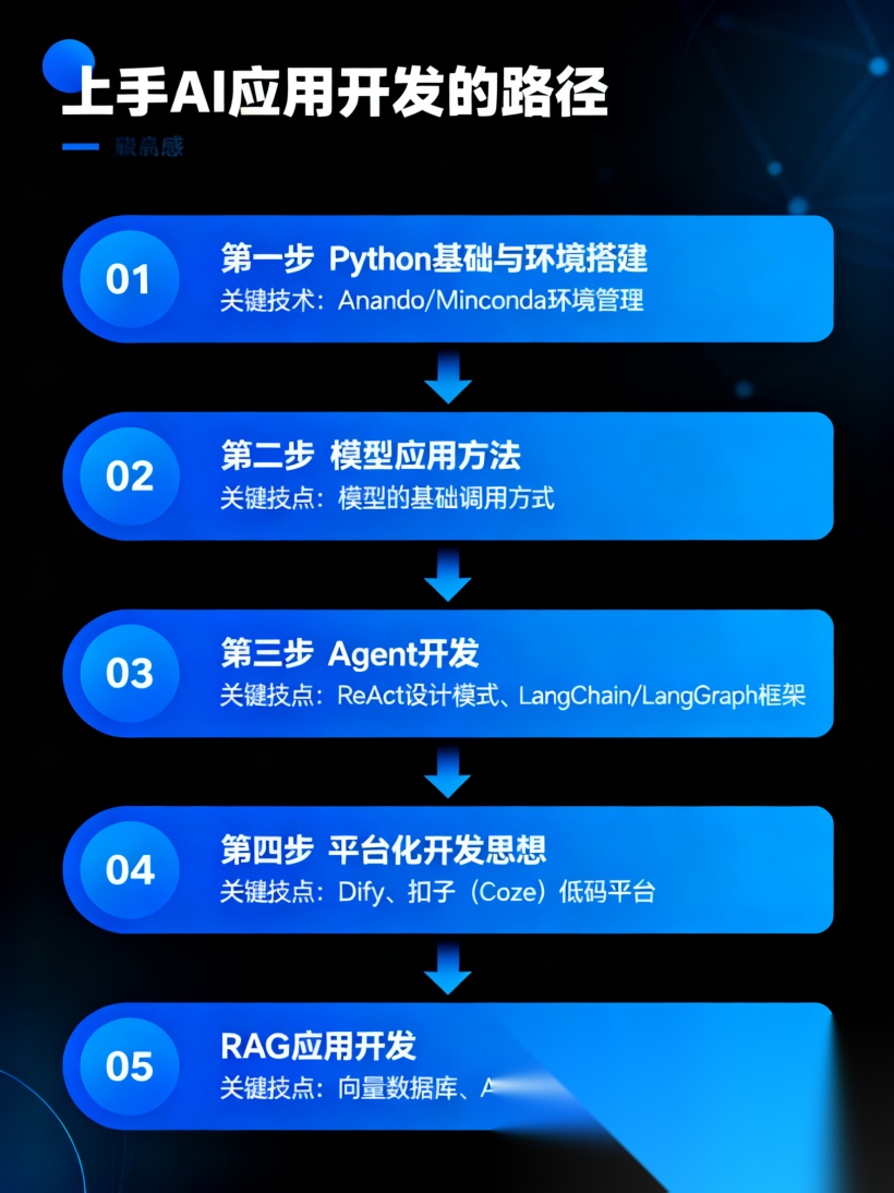 Agent开发是AI应用的核心部分。推荐从ReAct设计模式入手,学会使用OpenAI SDK搭建简单Agent实例。随着技能不断提升,可以通过LangChain、LangGraph等主流框架提升效率。之后,需要熟悉ReAct模式之外的计划模式、反思模式等,并掌握MCP、A2A协议及SDK调用方法。最终,拓展到多智能体系统的开发,以应对更复杂的业务场景。
