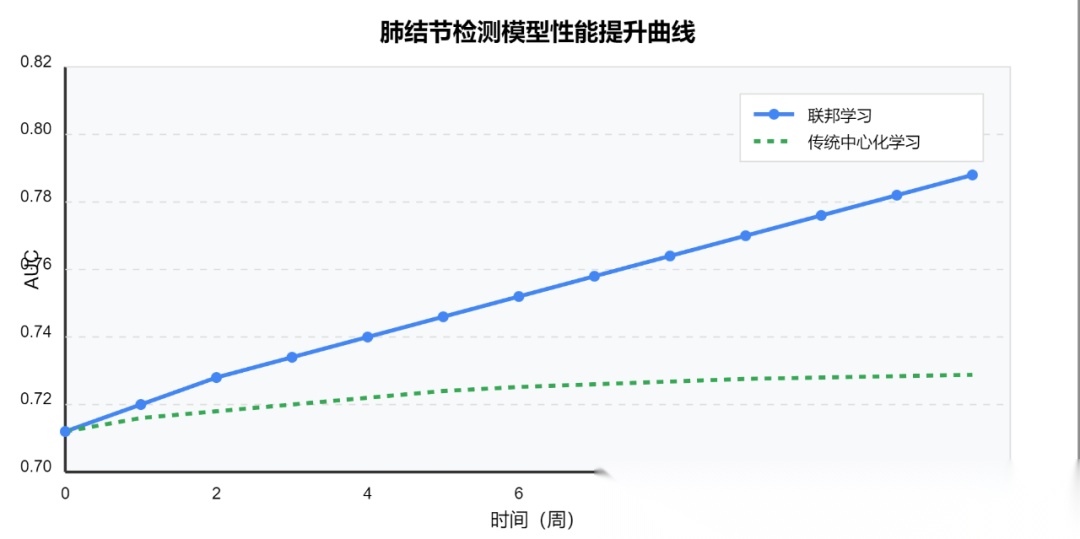 这种架构的优势在于数据始终保留在本地,仅有模型参数在网络中传输,极大降低了数据泄露风险。在医疗行业应用中,某三甲医院联合区域内多家医疗机构构建的肺结节检测系统采用了这一架构,使模型AUC每周稳定提升0.5-0.8%,三个月后累计提升了约8.5%。下图展示了联邦学习在医疗场景中的性能提升曲线: