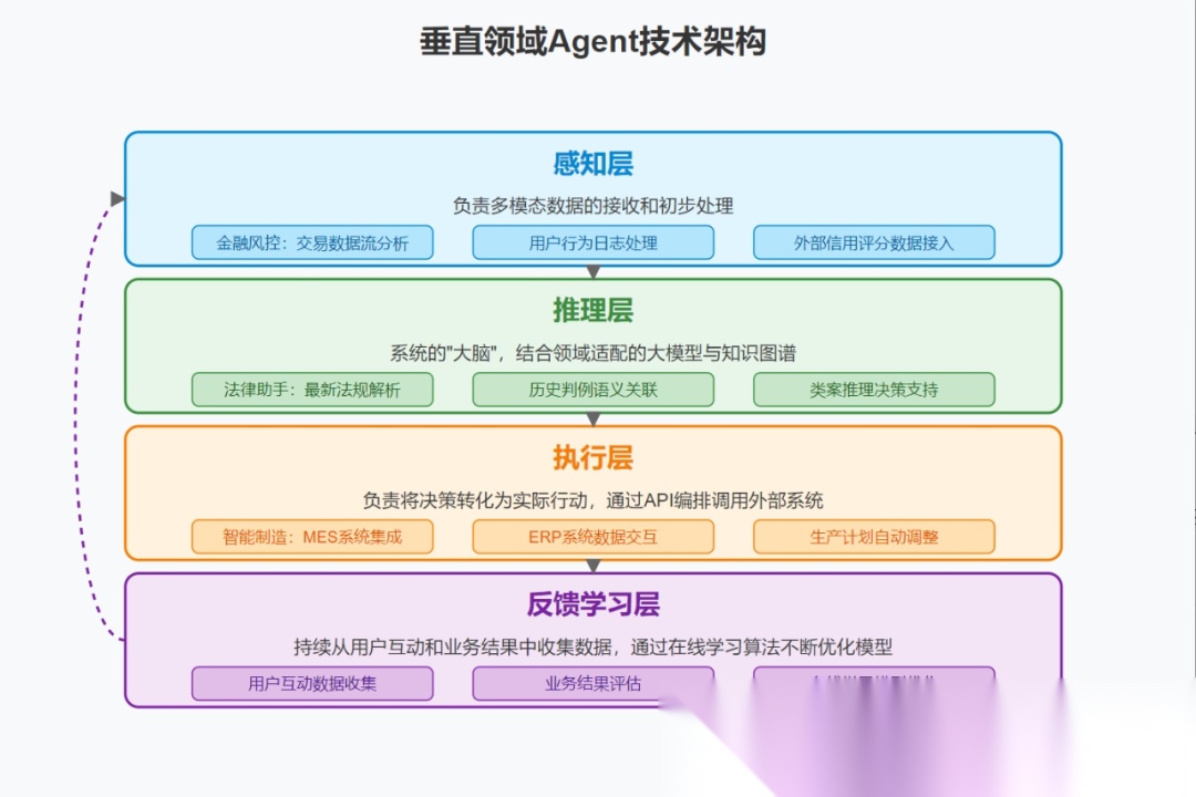 垂直领域Agent的技术架构设计需要充分考虑业务特性和性能要求,典型的分层架构包括感知层、推理层、执行层和反馈学习层四个核心部分。