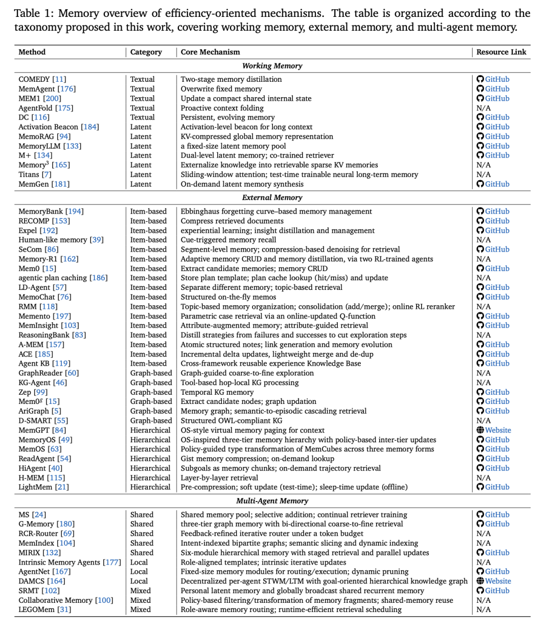 [Table 1: 效率导向机制的记忆概览] 该表按照论文提出的分类法组织,涵盖工作记忆、外部记忆和多agent记忆,列出了各方法的类别、核心机制和资源链接。