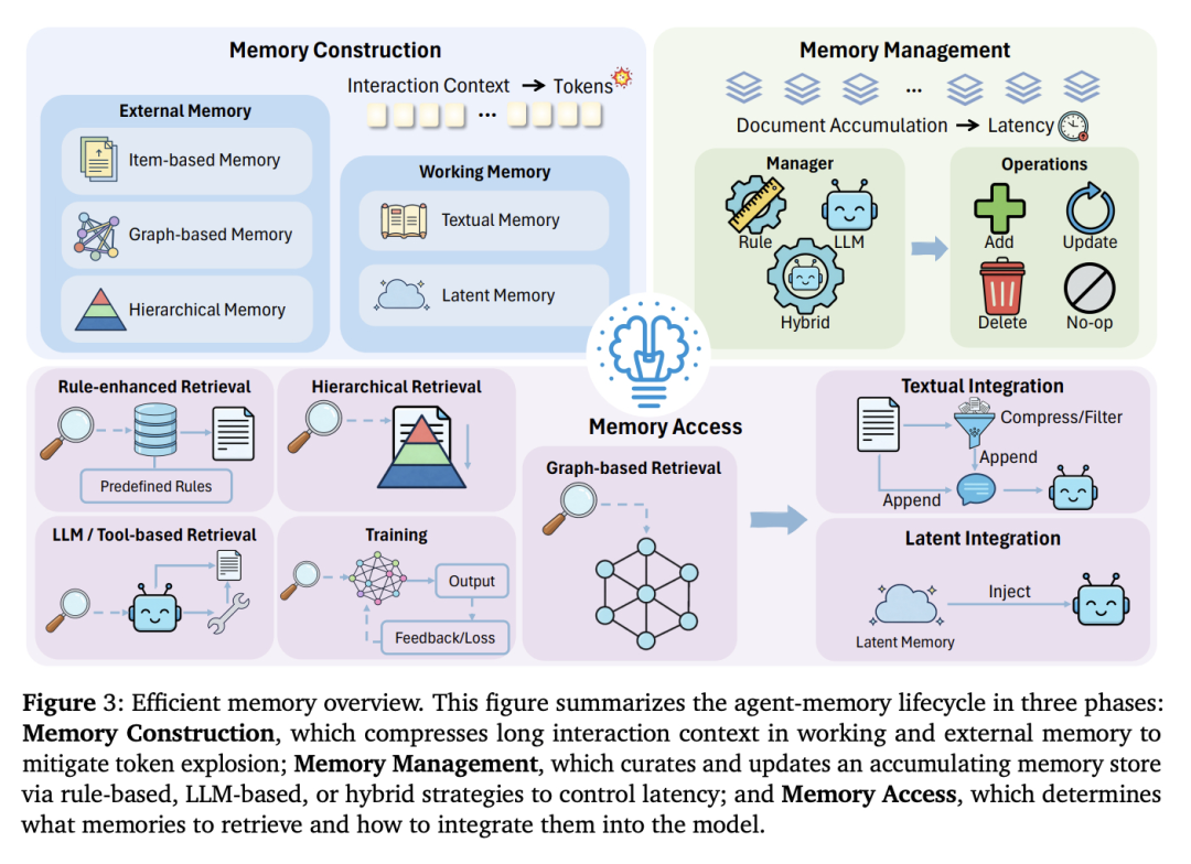 [Figure 3: 高效记忆概览] 总结了agent-记忆生命周期的三个阶段:记忆构建通过压缩工作记忆和外部记忆中的长交互上下文来缓解token爆炸;记忆管理通过基于规则、基于LLM或混合策略来整理和更新累积的记忆存储以控制延迟;记忆访问决定检索哪些记忆以及如何将其整合到模型中。