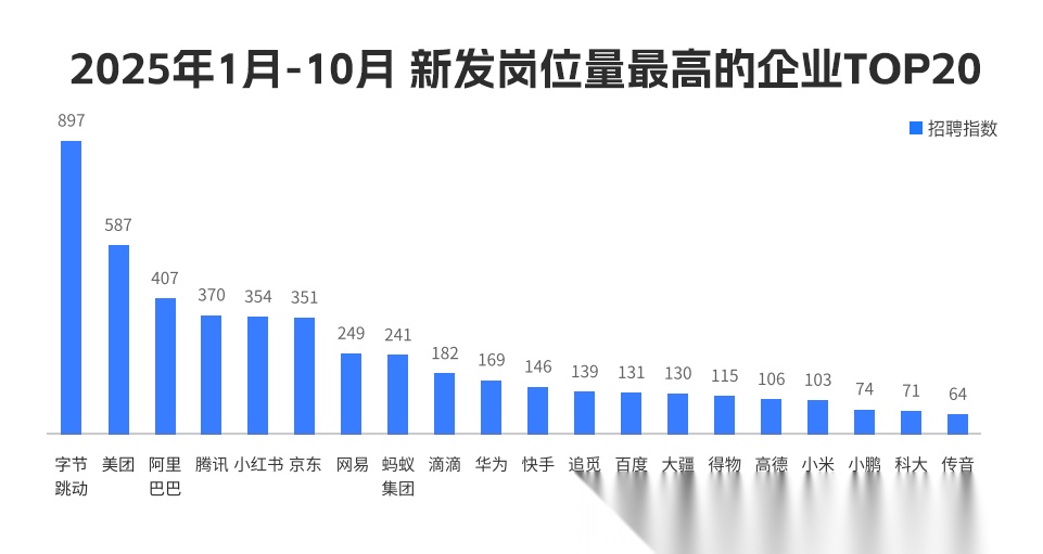 在25年1-10月,**头部企业的是人才需求的绝对主力,**其中,字节跳动的新发岗位量“断层式”领先,稳居热招企业首位;美团与阿里巴巴紧随其后,分列二、三位;腾讯位列第四;值得注意的是,小红书在竞争中超越京东、网易、蚂蚁集团,跻身热招企业前五。