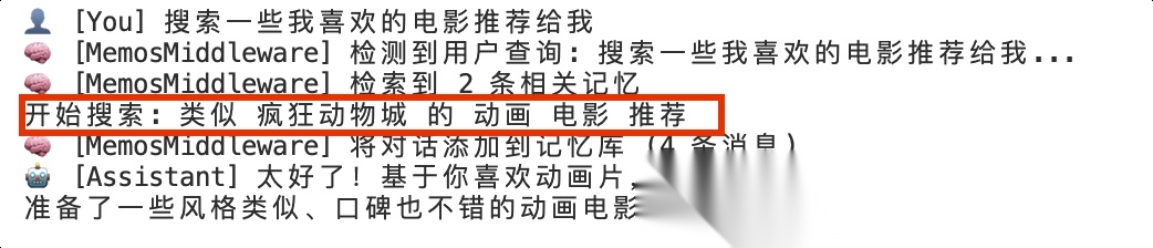 在这次对话中,Agent由于“回忆”到你“喜欢动画片,还关注疯狂动物城”,所以自动搜索类似的动画片来进行推荐 — 这体验了记忆对客户体验的价值。