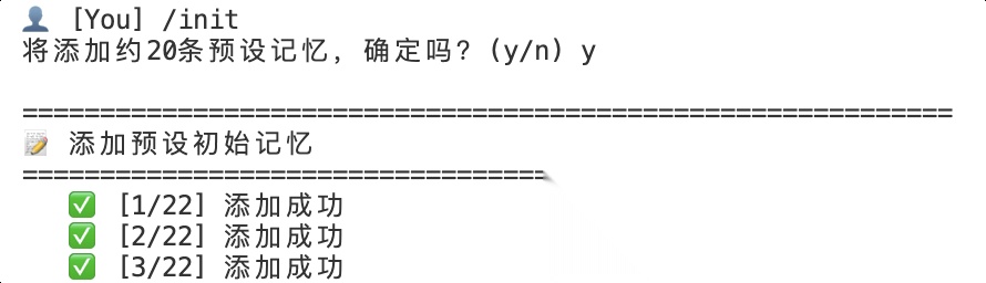 为方便观察,我们构建一个可交互的命令行程序,支持连续对话,也支持以 “/” 开头的管理命令(如清空记忆等)。不设置初始记忆,直接开始对话: