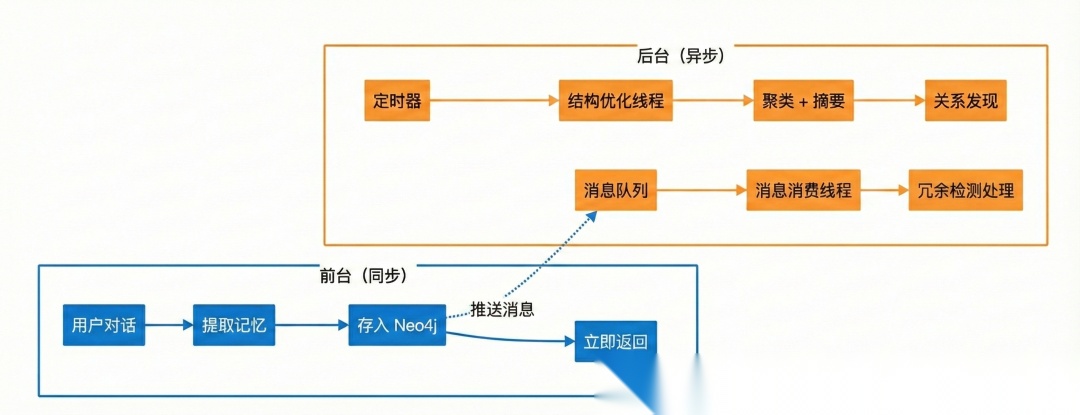因此 MemOS 采用异步后台记忆重组,把“添加”与“重组”解耦,其大致逻辑如图: