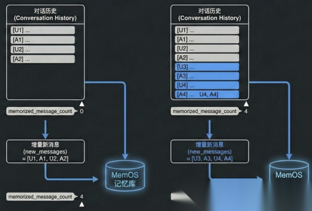 每次写入记忆时,用一个“指针”记录已经“记住”的对话位置;下一次写入时,只截取从指针之后的新增对话,用来生成增量记忆。这样你甚至不必每轮都触发“记忆”动作,比如每 2 轮一次、甚至更多轮一次都可以: