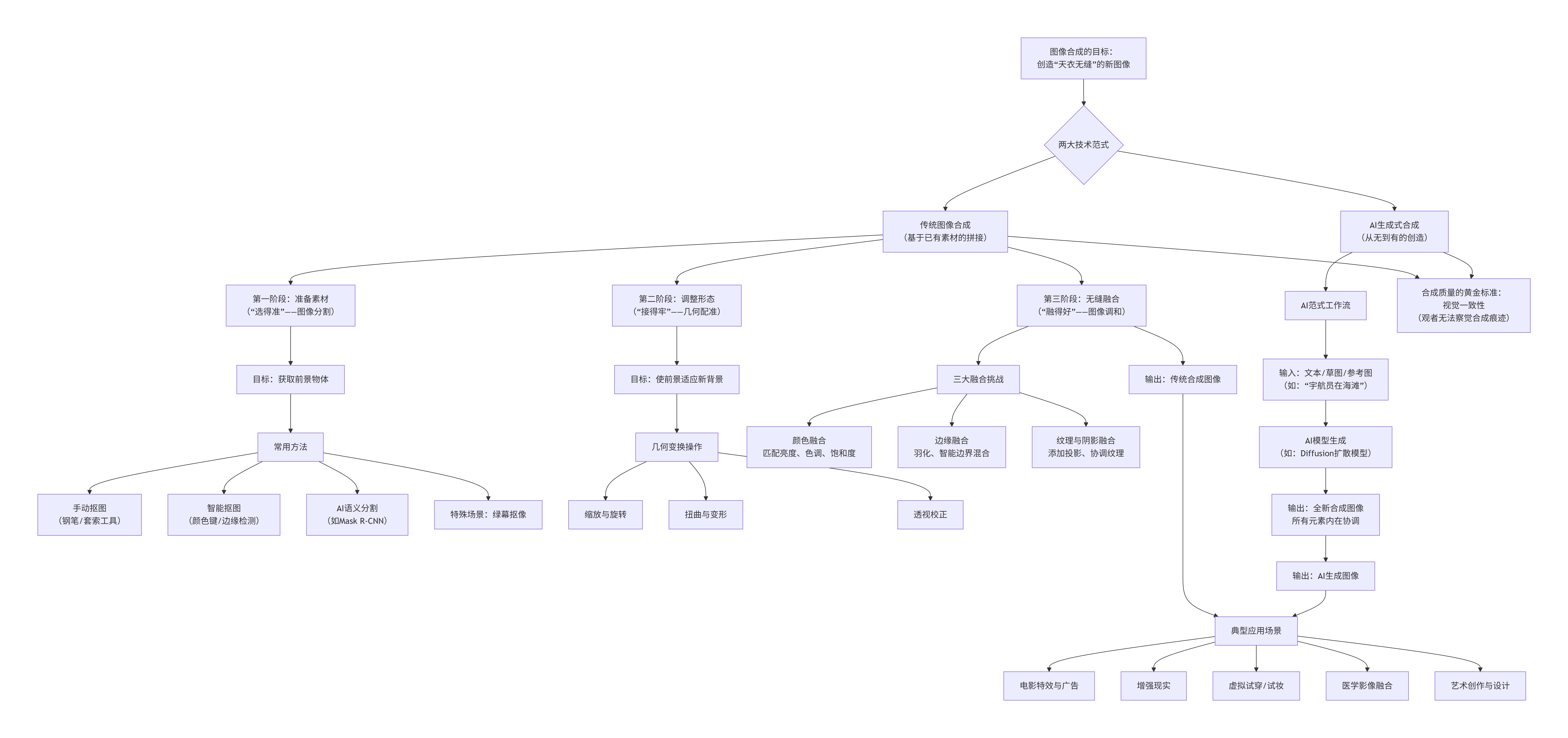 图像合成技术通过精准分割、几何配准和视觉融合三大步骤,将不同图像元素无缝拼接成自然协调的新画面。传统方法依赖精确抠图和智能融合解决光照、边缘等问题,而AI生成式合成则直接根据指令创造内在统一的图像。无论是电影特效、虚拟试穿还是艺术创作,其核心目标都是实现毫无PS痕迹的视觉一致性,让合成结果看起来天生自然。从传统拼接技艺到AI生成魔法,图像合成始终追求创造足以乱真的视觉谎言;。