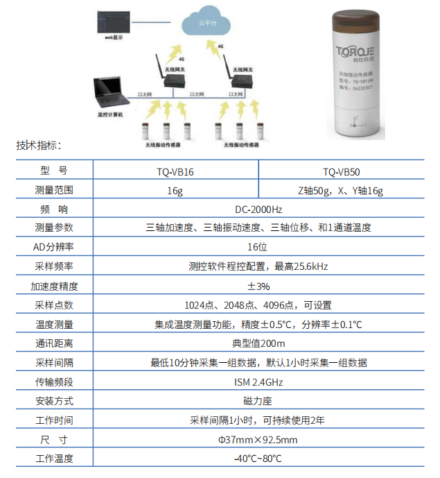 部署TQ-VB50 型无线智能振动传感器(Z 轴 50g 量程),通过磁力座安装于塔筒底部、中部等关键测点,配置1 小时采样间隔,数据通过无线网关汇总后经 4G 传输至云端平台。