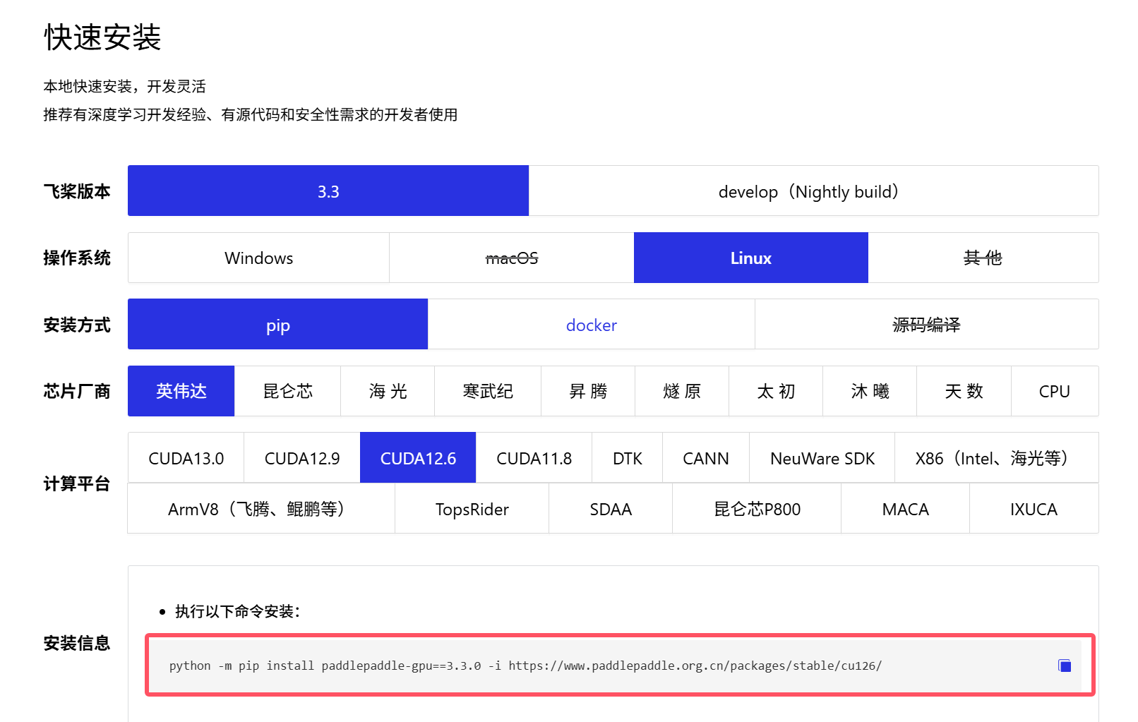 根据输出结果安装对应版本的 PaddlePaddle,然后我这里输出是12.6版本,进入paddlepaddle官网飞桨PaddlePaddle-源于产业实践的开源深度学习平台,然后选择自己对应配置的框架,复制安装命令后,进入自己对应的环境后进行安装