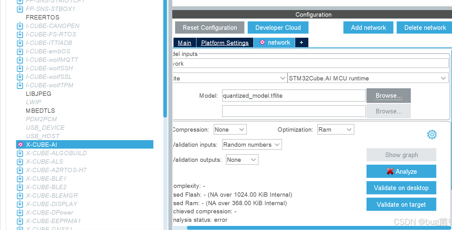 - 先把 X-CUBE-AI 的 Analyze 变成 OK(否则工程生成不完整)