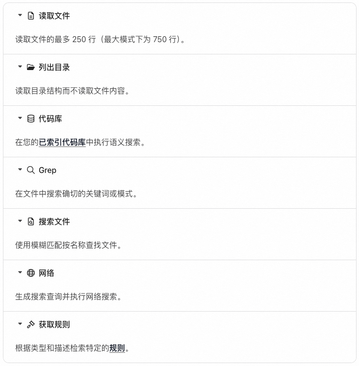 在上一部分,其实用到了很多工具,这是大语言模型与你的代码仓库进行交互的桥梁。我们知道,大模型的本质工作是读取token然后吐出token,并没有长出手来修改代码,也并不知道我们的私人仓库里有什么(因为不在它的训练集中),这些问题都需要“工具调用”能力来解决,也就是常说的Function Call。