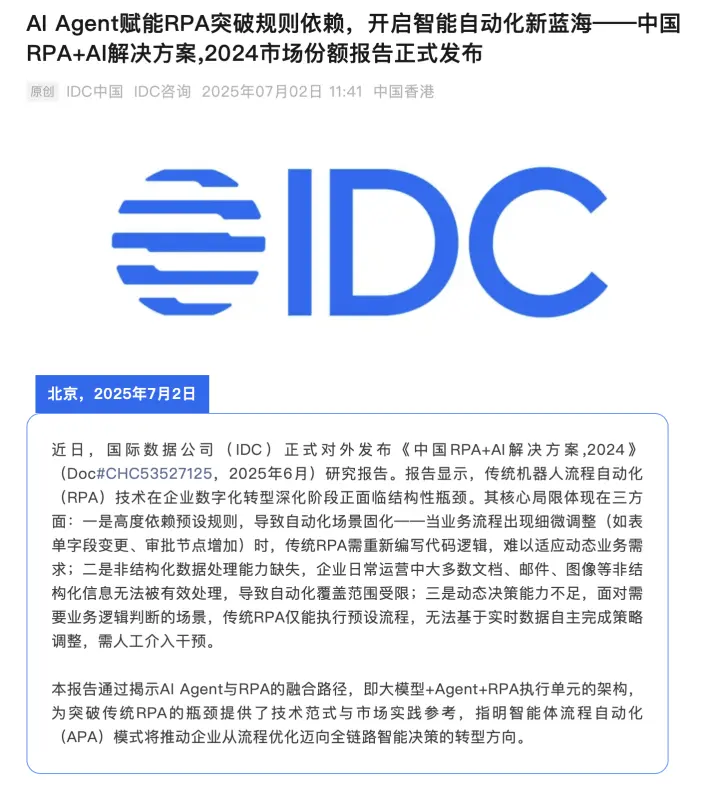 IDC 在 2025 年 RPA+AI 市场分析中指出,中国 RPA 市场规模将首次突破百亿,自动化正在成为企业基础设施级能力。