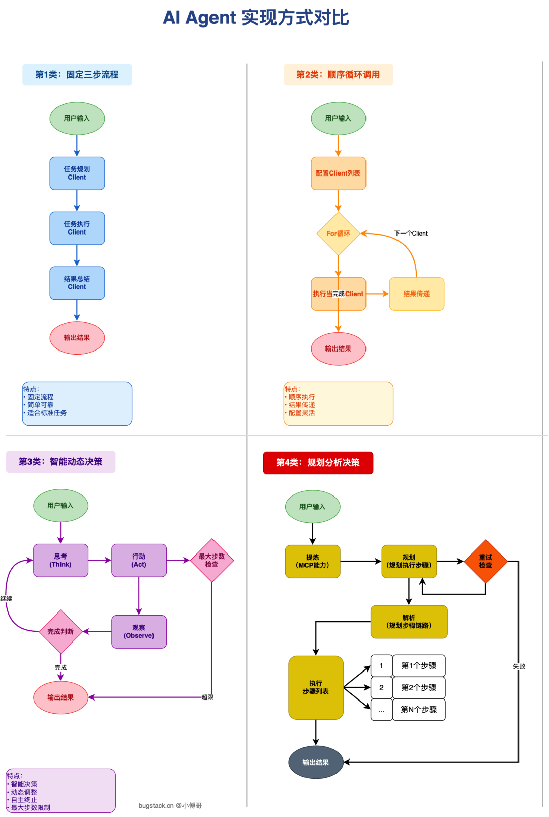 - 学习 AI Agent 多类执行设计模式,包括;固定链路模式、动态决策模式、规划分析模式。学习后,可以自行设计其他类型执行模式。