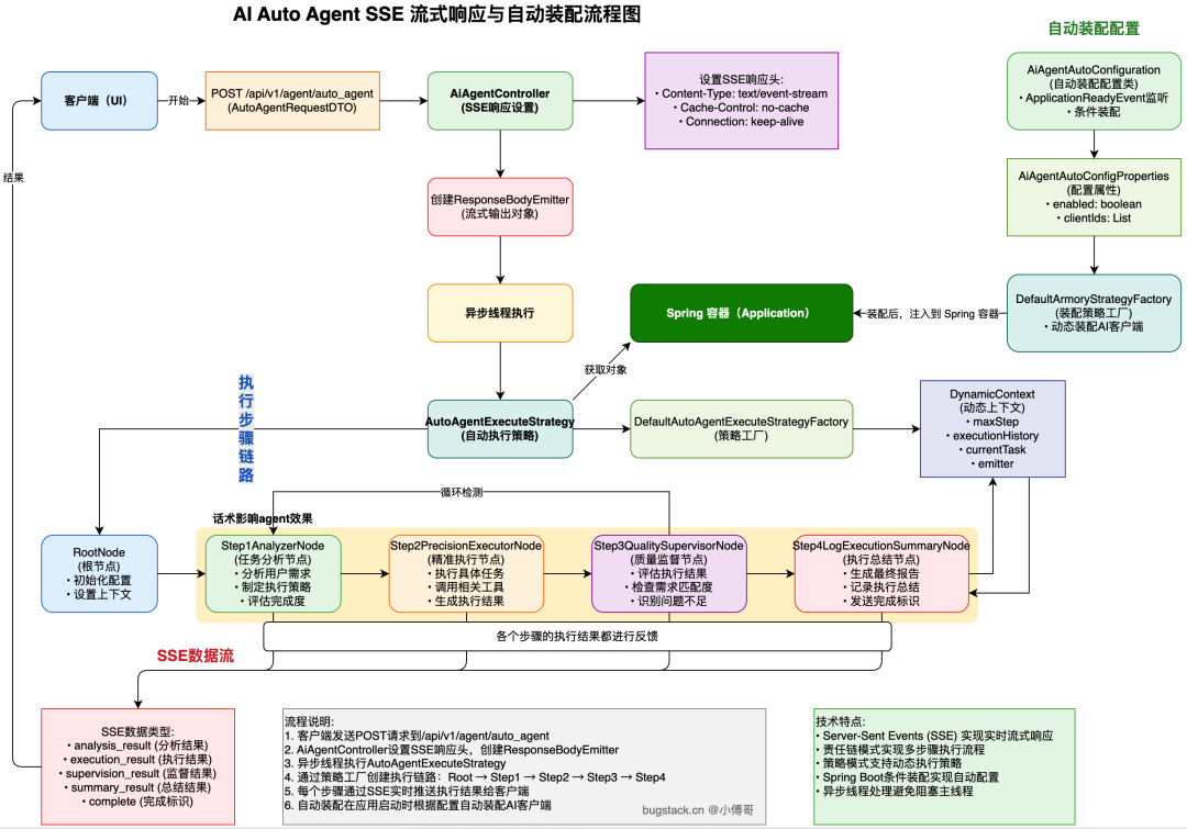 前面有伙伴问,为什么把实例化的对象写入到 Spring 容器,这里就是原因 - 客户端(UI),进行 POST 接口请求,这个过程需要封装一个 SSE 流式响应的接口,让 Step 1~4 各个执行步骤,把过程信息写入到流式接口。这里要注意,需要给接口返回的对象添加上对应的类型(什么步骤、什么节点、什么过程),以便于反馈给用户 Agent 在做什么。