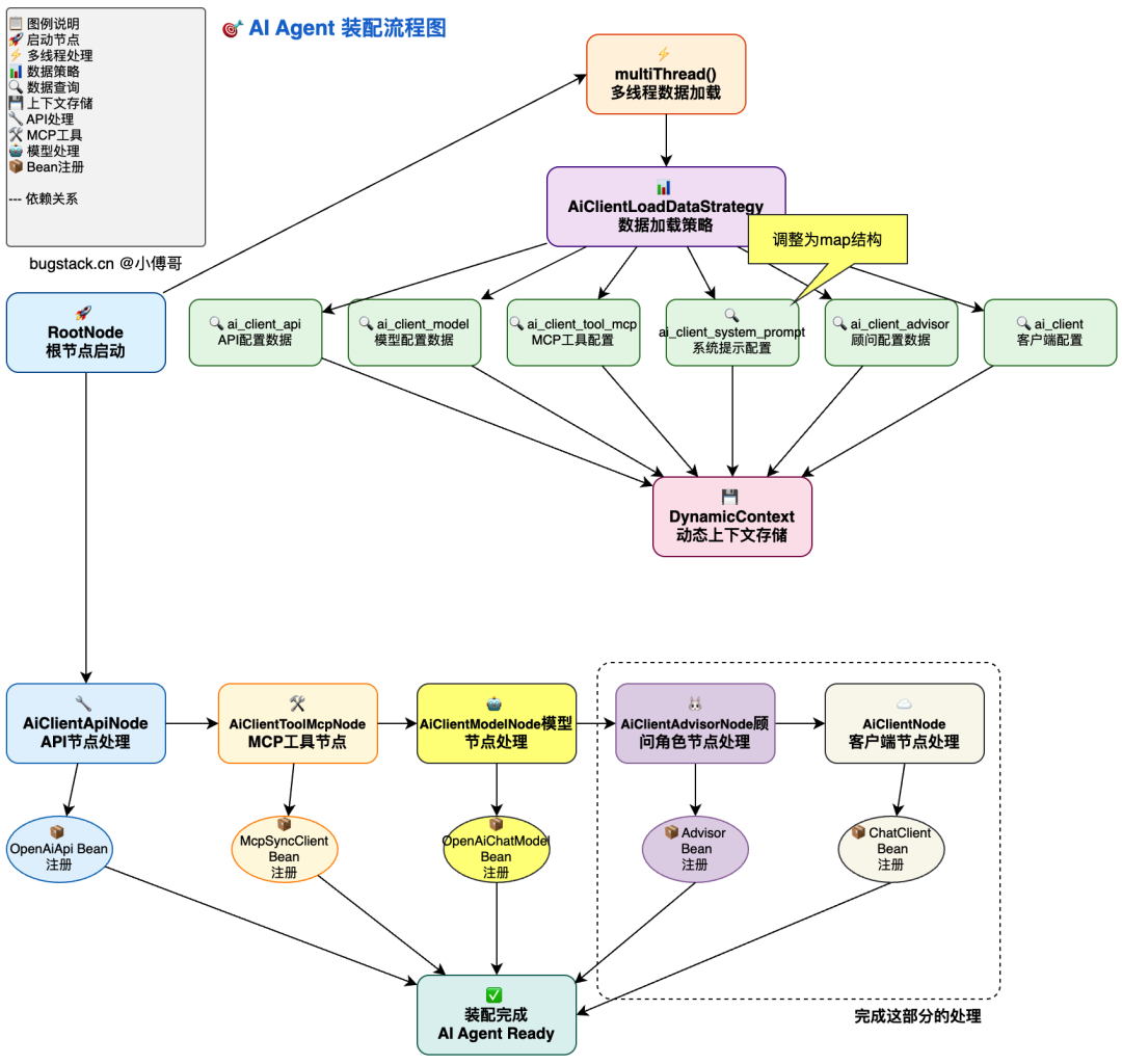 - 以程序启动为开始,进行自动化装配。这个过程我们先把一些想预先启动的数据库中的 agent 配置所需的 client 客户端进行服务初始化。之后写入到 Spring 容器,方便在执行 Agent 时进行使用。