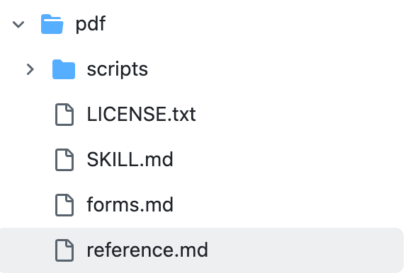 这些内容告诉LLM:“遇到这类任务时该怎么做”。这是一个官方处理PDF文件的技能目录: