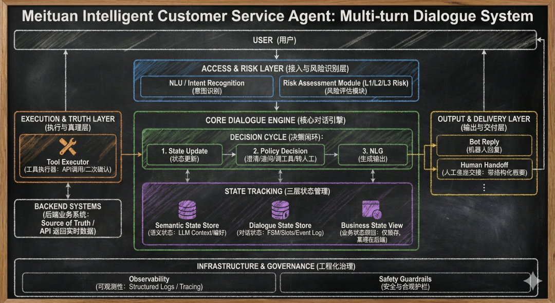 客服 Agent 的本质不是聊天机器人,而是一个以自然语言为交互接口的自动化业务执行系统。设计的核心目标是将高不确定性的用户输入,通过多轮交互,收敛为确定的、安全的、可回滚的业务指令。