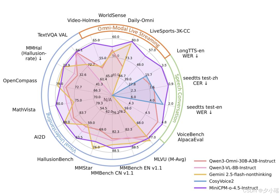 你会发现一个非常反直觉的点。MiniCPM-o 4.5 在视频理解、视觉问答、文档解析、语音相关指标上,并没有明显退一步,甚至在一些实时场景下更稳定。