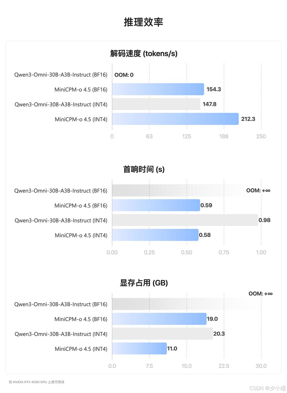 在同样的 RTX 4090 上测试,9B 的 MiniCPM-o 4.5,INT4 量化后解码速度能到 200 tokens/s 以上,首响时间稳定在 0.6 秒左右,显存占用只有 11GB。