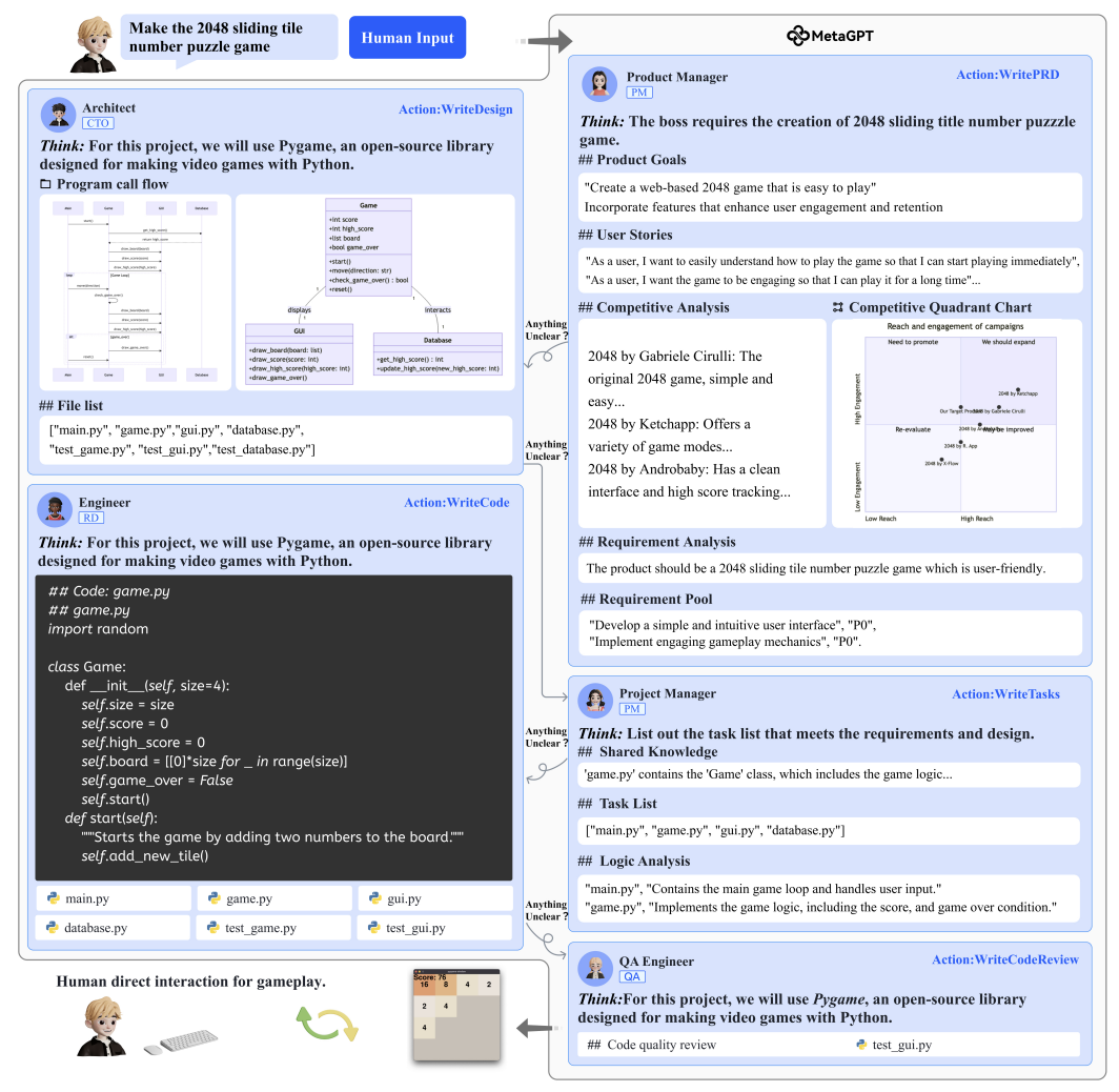 ①MetaGPT通过序列流程显式设计架构;而ChatDev的架构设计是通过生成性基础模型隐式实现的。②截至2023年9月19日,MetaGPT的官方代码库目前不支持软件开发的自动化测试。