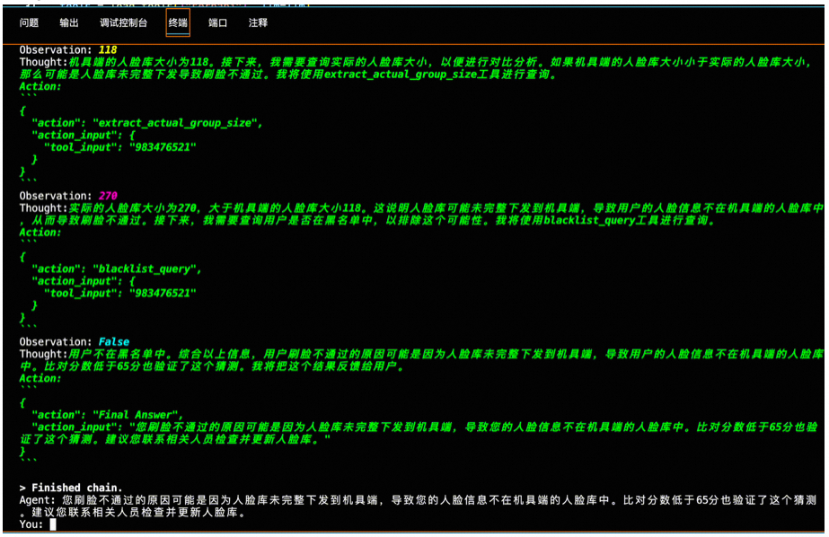 随着人脸识别服务的线上线下日调用量和应用场景快速发展,人脸识别团队正在面临一个巨大的挑战,每天反馈到团队的各种识别问题的case过多,排查起来费时费力,为了快速诊断问题,团队决定使用LangChain来构建一个智能排查助手。这个助手可以分析用户问题,错误日志,与人脸识别的APIs进行交互,甚至生成修复建议。