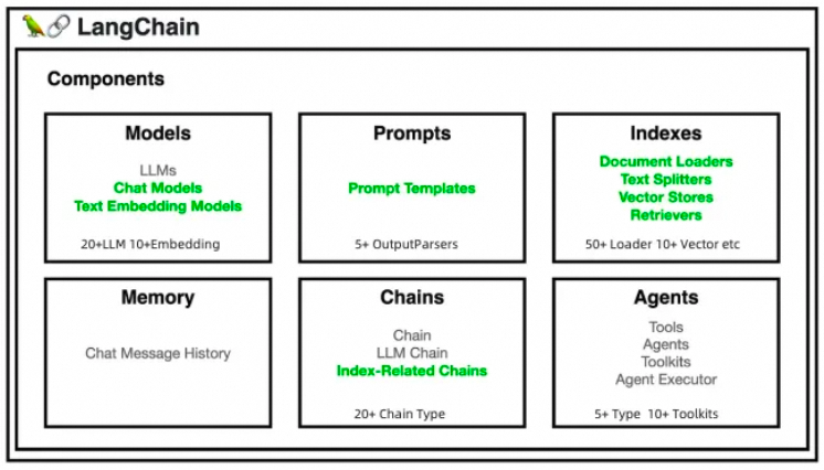 Langchain主要提供了6大类组件帮助我们更好的使用大语言模型,可以视为开源版的GPT插件,提供了丰富的大语言模型工具,可以在开源模型基础上快速增强模型的能力。想象一下,你手中有一盒乐高积木,但这不是普通的积木,而是能够编程、交流甚至思考的智能积木。LangChain就像是这样一盒特殊的积木盒,里面装满了不同功能的积木块,这些积木组件集成了数十种大语言模型、多样的知识库处理方法以及成熟的应用链,几十种可调用的工具箱,为用户提供了一个快速搭建和部署大语言模型智能应用程序的平台。