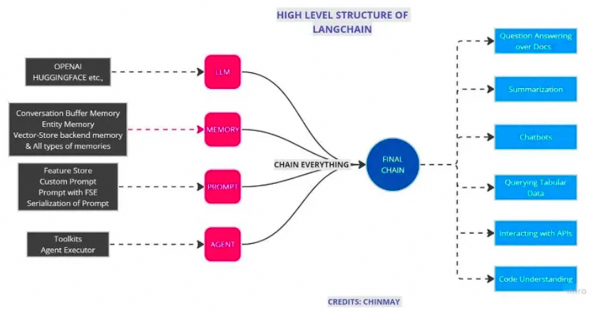 另一个例子,如果你想要一个可以帮你总结长篇报告的工具,单用GPT-4可能会因文章太长而无法处理。LangChain提供的工具就像是设计用来构建复杂构造的专用乐高积木,它可以帮你把长篇报告切分成小部分让GPT-4处理,再将结果整合起来,最终生成一个完整的摘要。