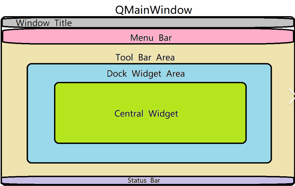 大多数时候客户端窗口的主体是QMainWindow而不是QWidget,QWidget是其中的组成部分。QMainWindow的组成如下: