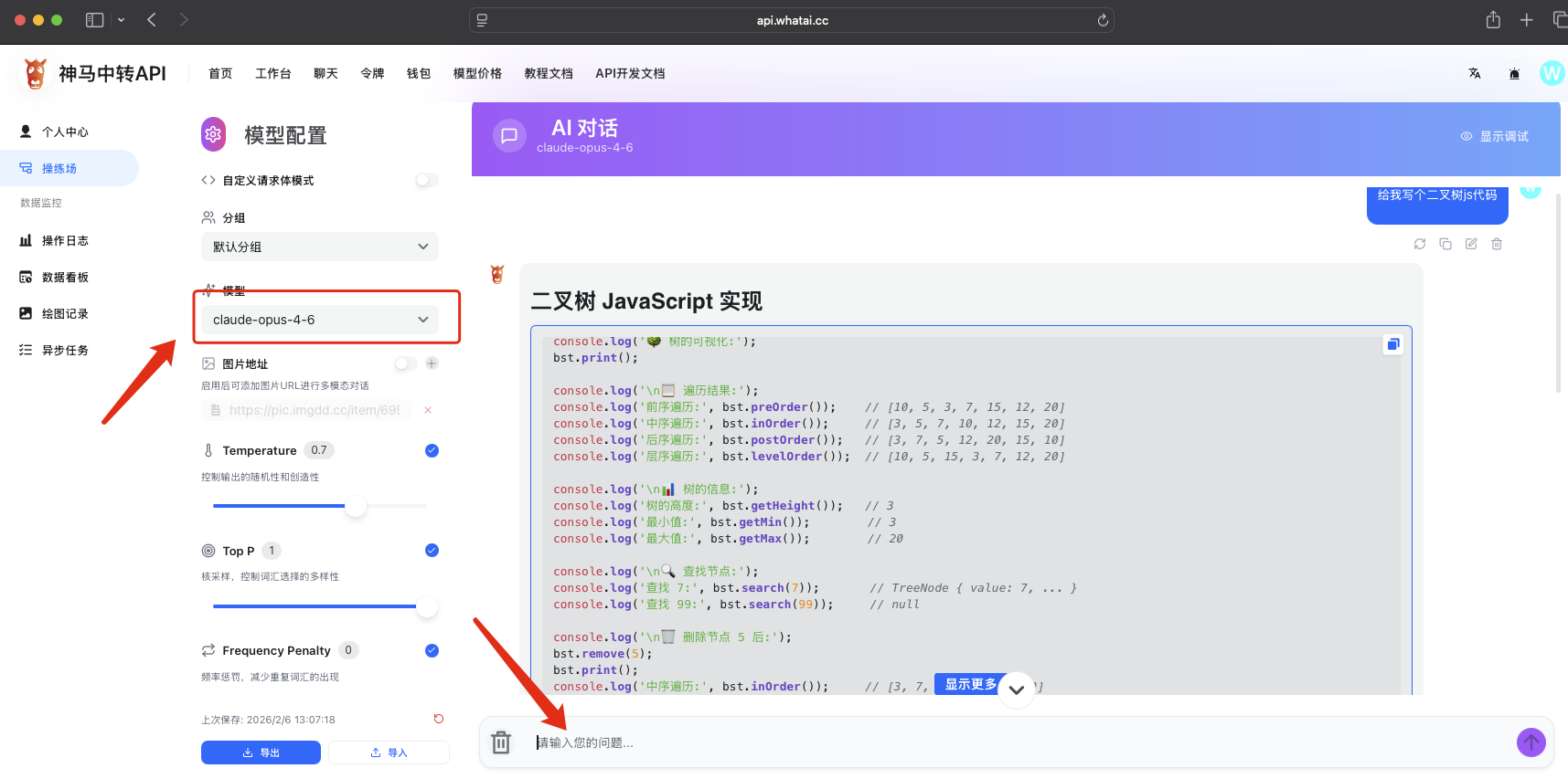 首页-工作台-操练场选择模型claude-opus-4-6,输入问题测试使用