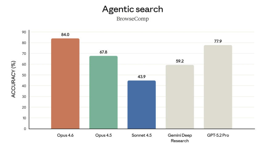 Opus 4.6 在深度、多步骤代理搜索方面获得了业内最高分。