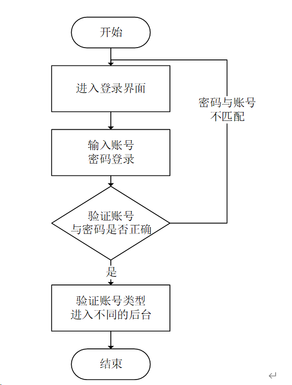 登录流程是该系统的第一个流程,登录的第一步是输入账号、密码登录,系统会验证账号与密码是否正确,正确时系统会判断账号类型再进入不同的;不正确时,会返回到登录的第一步,输入用户重新执行登录流程。该流程如图3-3所示。