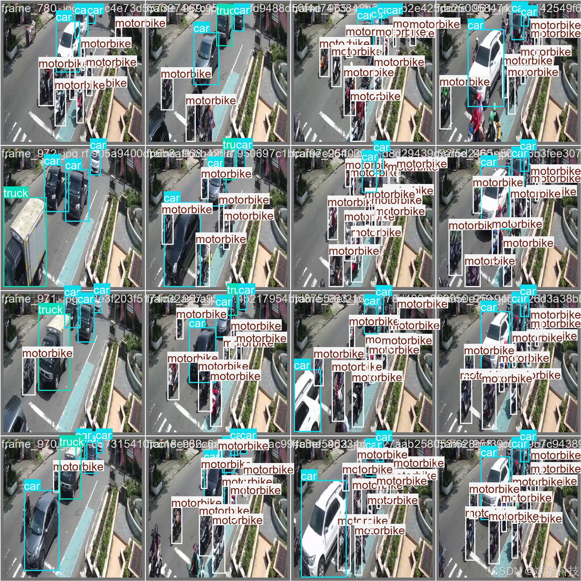 在算法层面,系统创新性地整合了YOLOv8、YOLOv10、YOLOv11及YOLOv12四种先进的检测模型,支持用户根据不同的精度与速度需求进行动态切换与对比,为车辆检测任务提供了灵活的解决方案。系统针对公交车、小汽车、摩托车、卡车这四类常见道路车辆(对应nc=4)进行检测,并基于一个包含1000张精心标注图像的数据集(训练集750张、验证集100张、测试集150张)进行模型训练与评估,确保了模型在实际场景中的泛化能力。