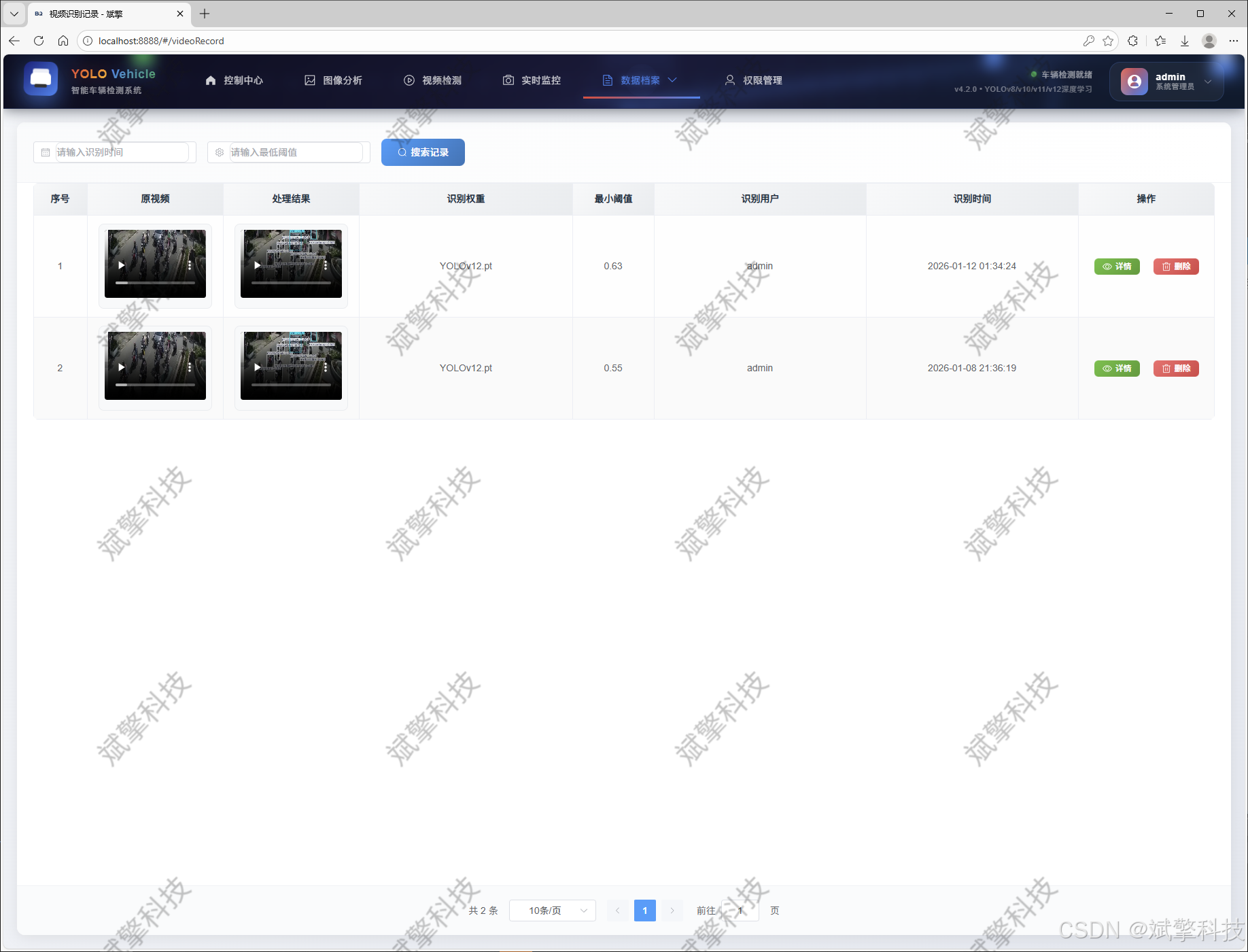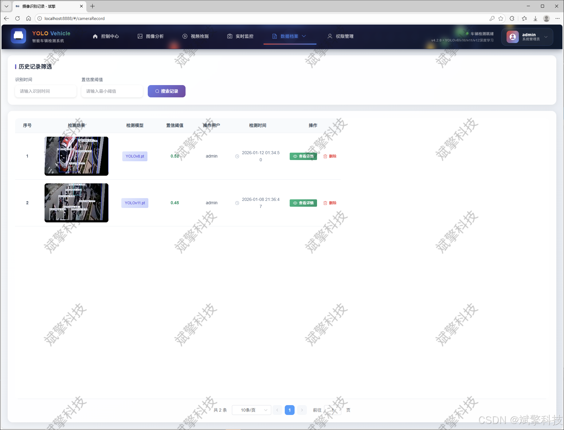 多功能、模块化的检测与管理:支持图片、视频、实时摄像头三种输入源的检测,覆盖了主要应用场景。所有检测记录均被系统化管理,并设有独立的图片记录、视频记录、摄像头记录管理模块,支持历史查询与结果回溯。