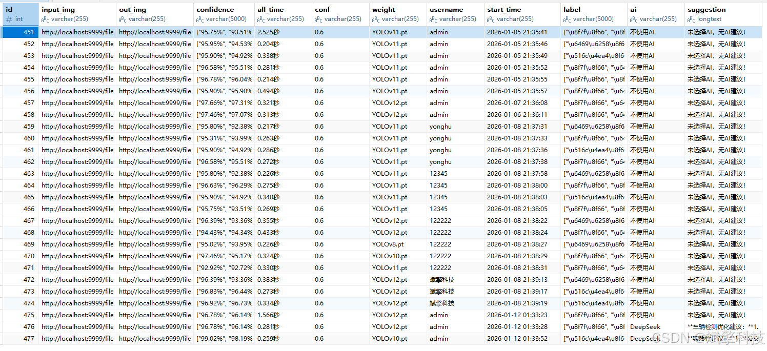 本系统的成功实现,不仅验证了最新YOLO算法在车辆检测任务上的有效性与工程实用性,也展示了一套将前沿深度学习模型、企业级Java后端开发、AI大模型融合与现代化前端技术相结合的全栈解决方案,为智能交通监控、车辆统计分析等应用场景提供了具备高可用性、可配置性与智能交互能力的原型平台。