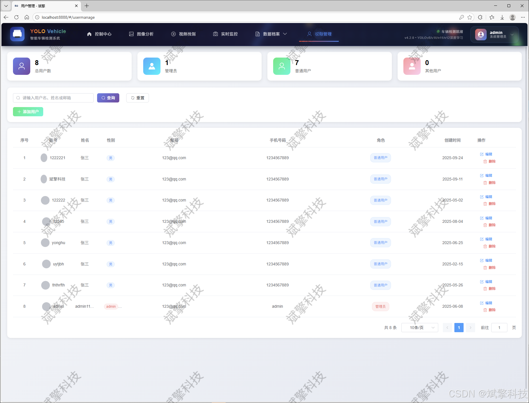 在功能层面,系统构建了完整的用户管理体系,实现了基于MySQL数据库的用户注册、登录(含密码安全检测)与权限控制。管理员拥有对系统用户进行增删改查的全局管理能力,而普通用户则可在个人中心修改个人信息、头像及密码。系统的核心检测功能覆盖图像上传检测、视频文件分析以及摄像头实时流媒体检测三种模式,所有检测记录(包括时间、目标类别、置信度、原始文件路径与结果文件路径)均被持久化存储至数据库,便于后续的查询、统计与分析。