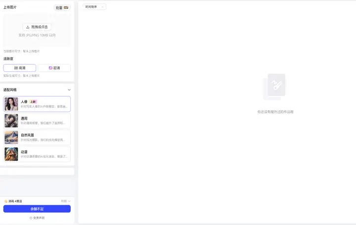 佐糖是一款一站式AI图片处理工具,图片变清晰是其核心功能之一。整体操作流程比较直接,上传图片后即可完成清晰度提升。功能中提供4个AI模型(基础/通用、高清、超清、破损照片修复),可根据图片情况选择,无论是普通模糊图片,还是存在破损的照片,都可以一键修复。