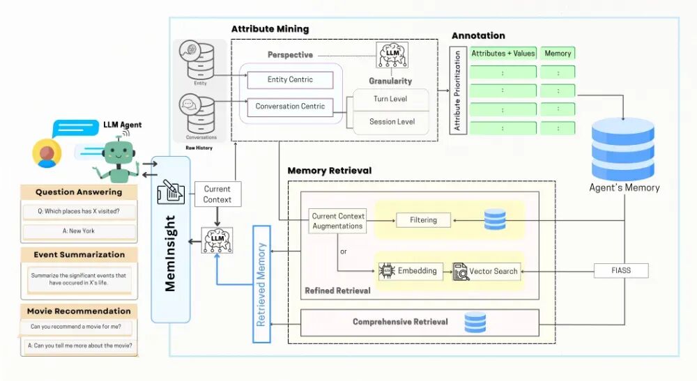 图 4. MemInsight框架:包含属性挖掘、标注和记忆检索