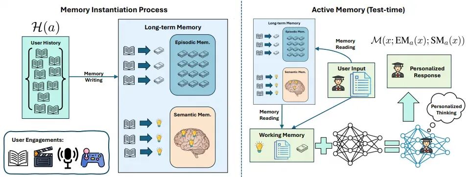 认知双记忆建模:将人类认知中的两类核心记忆机制引入 LLM 个性化体系:一方面,通过情景记忆(Episodic Memory, EM)对用户历史事件与交互过程进行建模,并采用近期优先的召回策略以刻画短期上下文与具体经历;另一方面,通过语义记忆(Semantic Memory, SM)对用户稳定的长期观念与偏好进行抽象表示,利用面向任务的参数化微调进行编码,从而为模型提供持续、结构化的个性化认知基础 。
