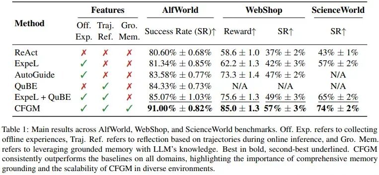 团队在AlfWorld(虚拟家务任务)、WebShop(电商交互)与 ScienceWorld(文本式科学实验)三个数据集上进行验证。实验结果表明,在这三类环境中,CFGM 均显著优于各基线策略:在 AlfWorld 上成功率超过基线约 10.4%、在 WebShop 上提高约 20%、在 ScienceWorld 上提升约 31%,展现出更强的任务完成能力和更稳健的规划表现。消融研究进一步表明,CFGM 的各个组成部分(粗粒度焦点驱动的经验收集、混合粒度经验提示提取、细粒度关键信息反思机制)均对整体性能有增益,整体框架的集成取得最高效果,并且在不同规模和类型的LLM Agent上表现出良好的泛化性。这些结果验证了粗到细层次记忆机制在多样规划任务中提高经验质量、多样性与错误修正能力的有效性。