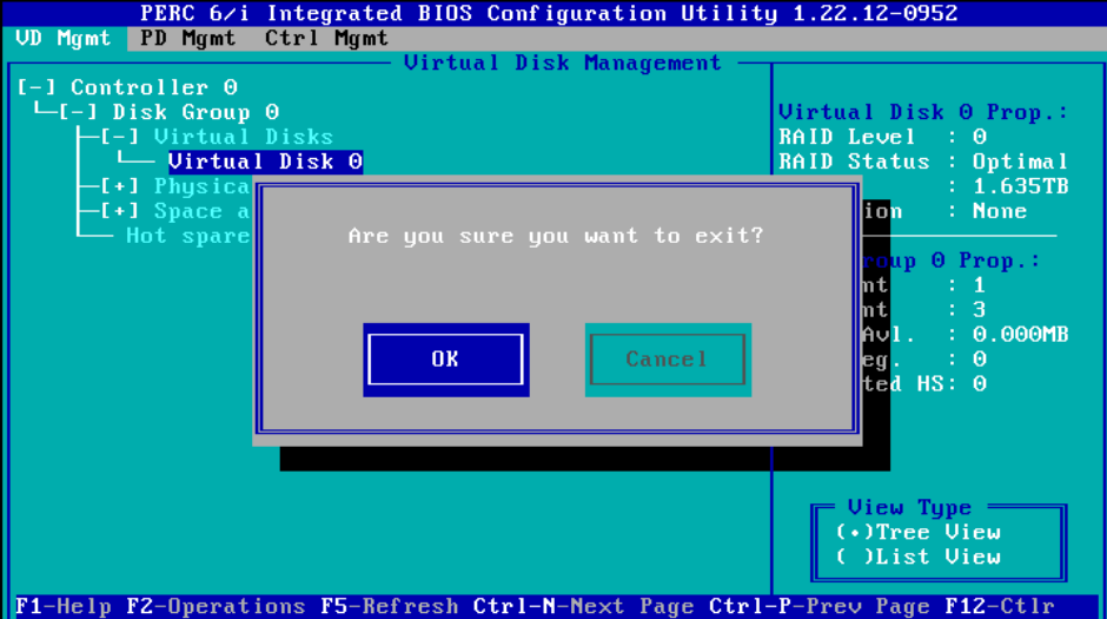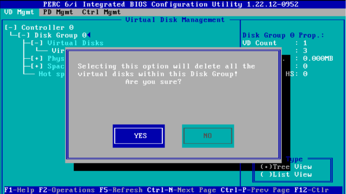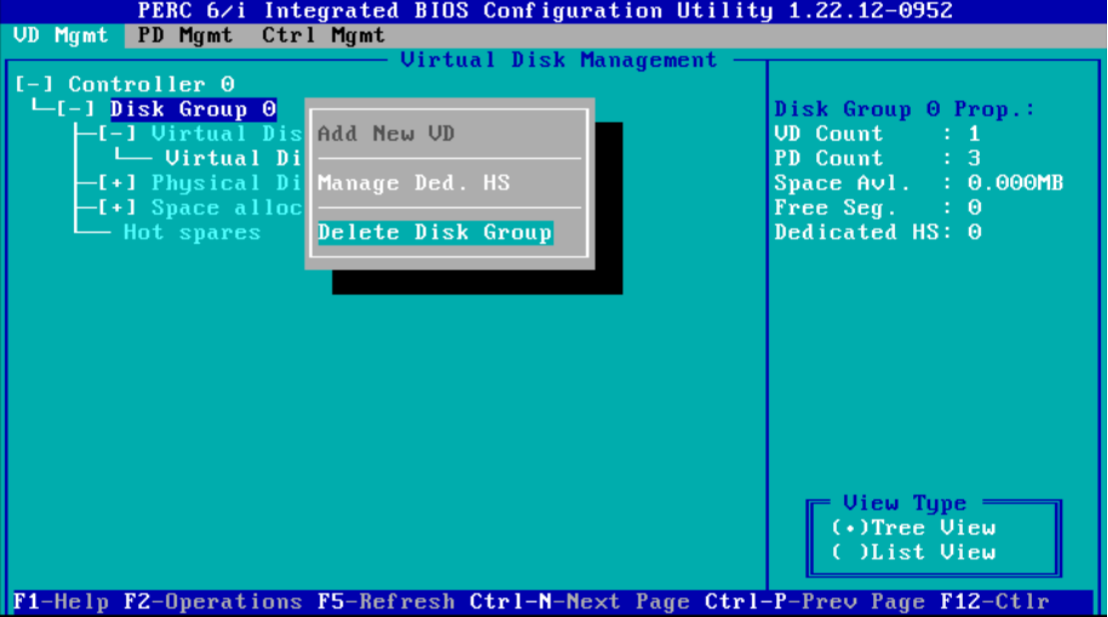 3、使用上下键移动到第二行的位置按下 F2,出现以下窗口,选择第二项( Delete Disk Group)然后回车,删除 raid5