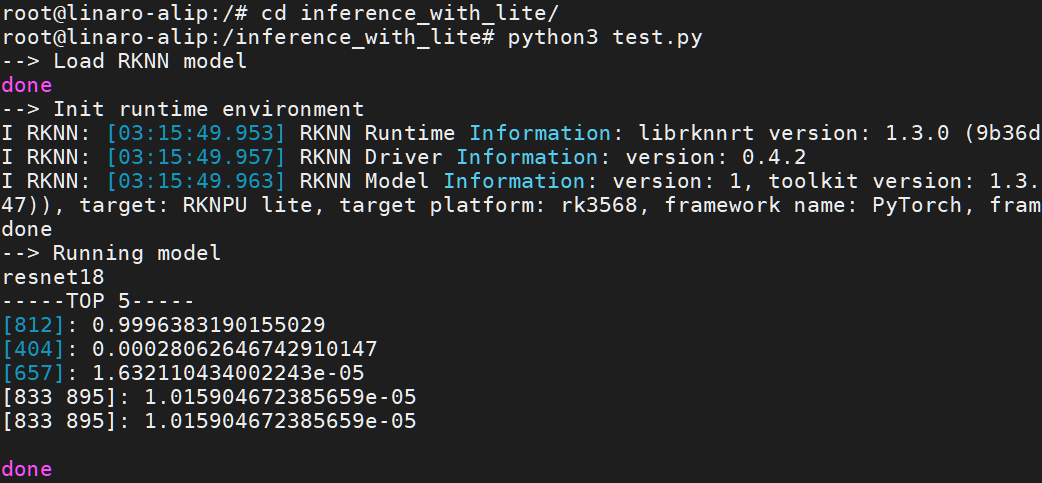 2 下载网盘资料中“iTOP-3568开发板\02_【iTOP-RK3568开发板】开发资料\11_NPU使用配套资料\04_RKNN-Toolkit-lite2工具”中rknn_toolkit_lite2.tar.gz压缩包,在windows上解压,然后通过U盘拷贝rknn_toolkit_lite2/examples 文件夹下的 Demo inference_with_lite 放入RK3568开发板,这个demo是通过resnet残差神经网络识别”space_shuttle_224.jpg”这幅图片,然后运行,输入以下命令: