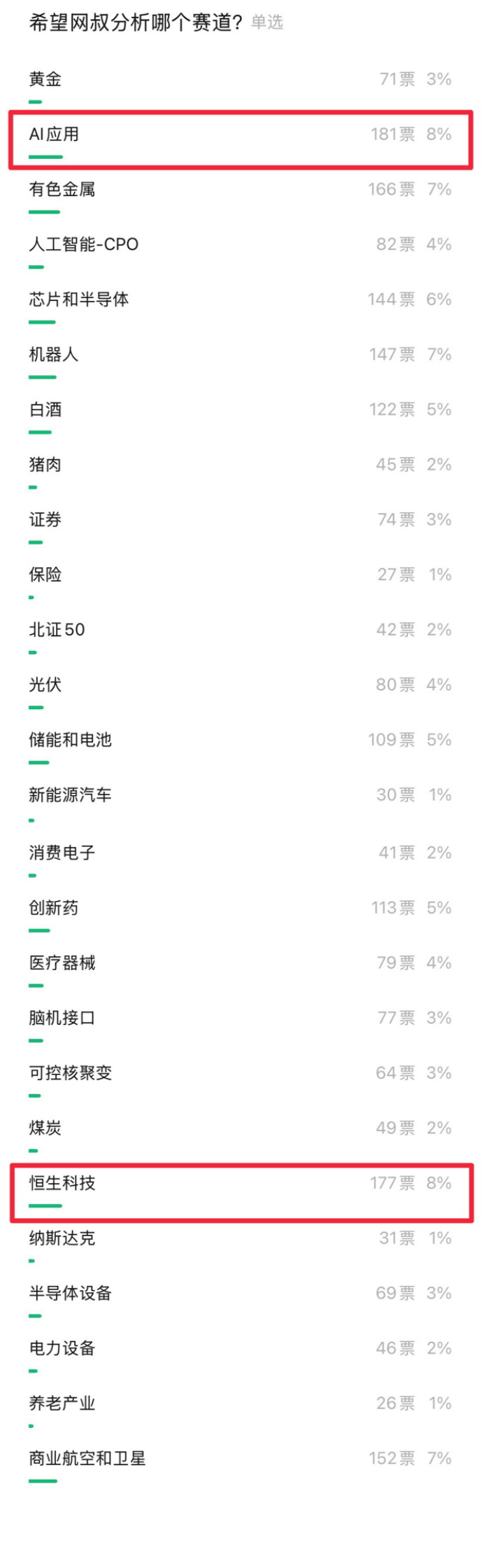 投票排名第二的恒生科技和AI应用的逻辑高度重合,