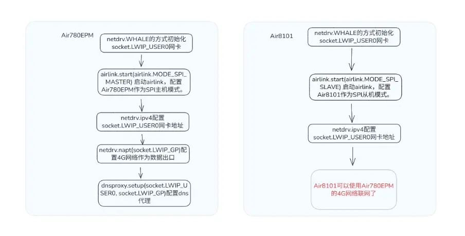 通过 airlink 实现多网融合功能:通过 spi 或 uart 方式连接两台设备;