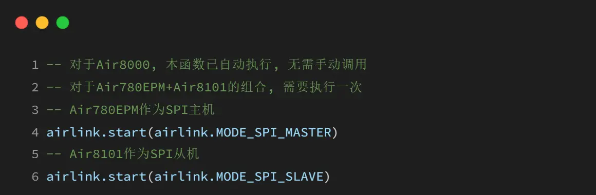 Airlink 是 luatOS 提供的一种设备间通讯协议,主要用于设备内部或设备间的数据通信,支持 SPI 和 UART 两种通信方式。主要应用于 Air8000 内部以及 Air6101/Air8101 和 Air780EXX 之间的通信;