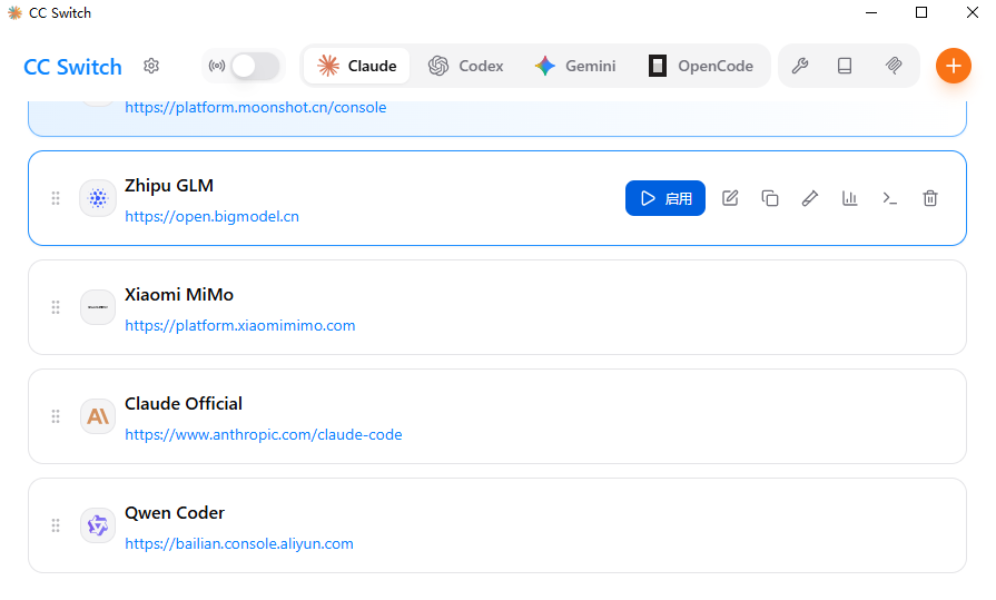 如果你不喜欢每次手动修改环境变量,CC-Switch 是一个更优雅的选择。它是一款开源桌面应用,提供图形化界面来管理和切换多个 API Provider 配置,支持 Claude Code、Codex、Gemini CLI 等主流 AI 编程工具。