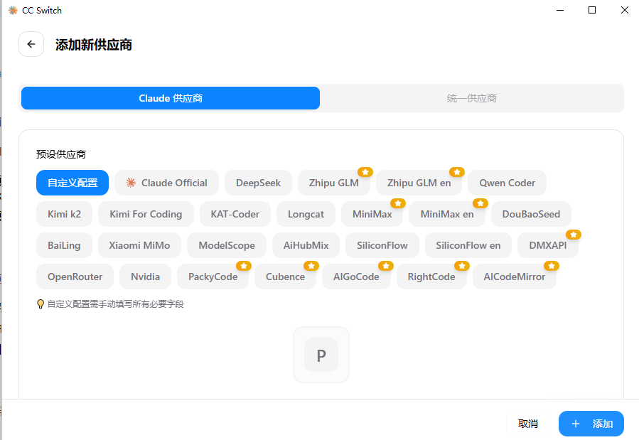 - 使用内置预设(推荐):CC-Switch 内置了大量常用 Provider 模板(Moonshot、智谱、DeepSeek 等),选择后填入 API Key 即可