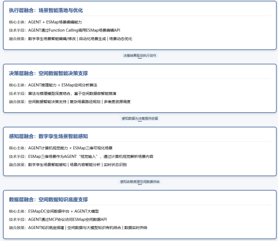 数字孪生技术与AGENT技术的融合体现在数据层、感知层、决策层和执行层四个维度:
