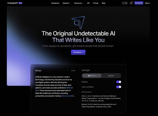 StealthGPT 同样以“绕过AI检测”为核心,强调适用于论文、邮件、创意写作等多种文体,但更偏向通用场景。