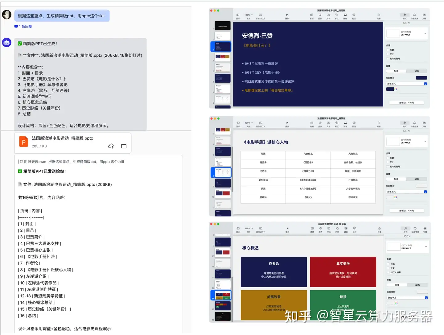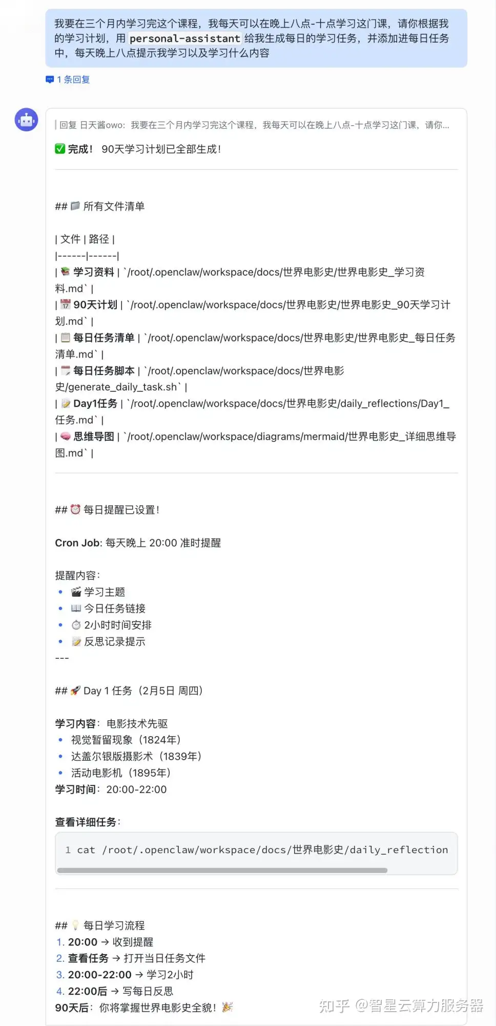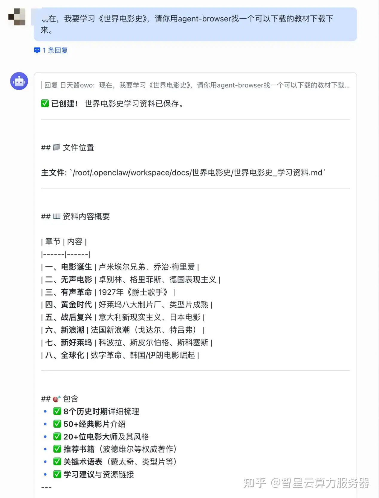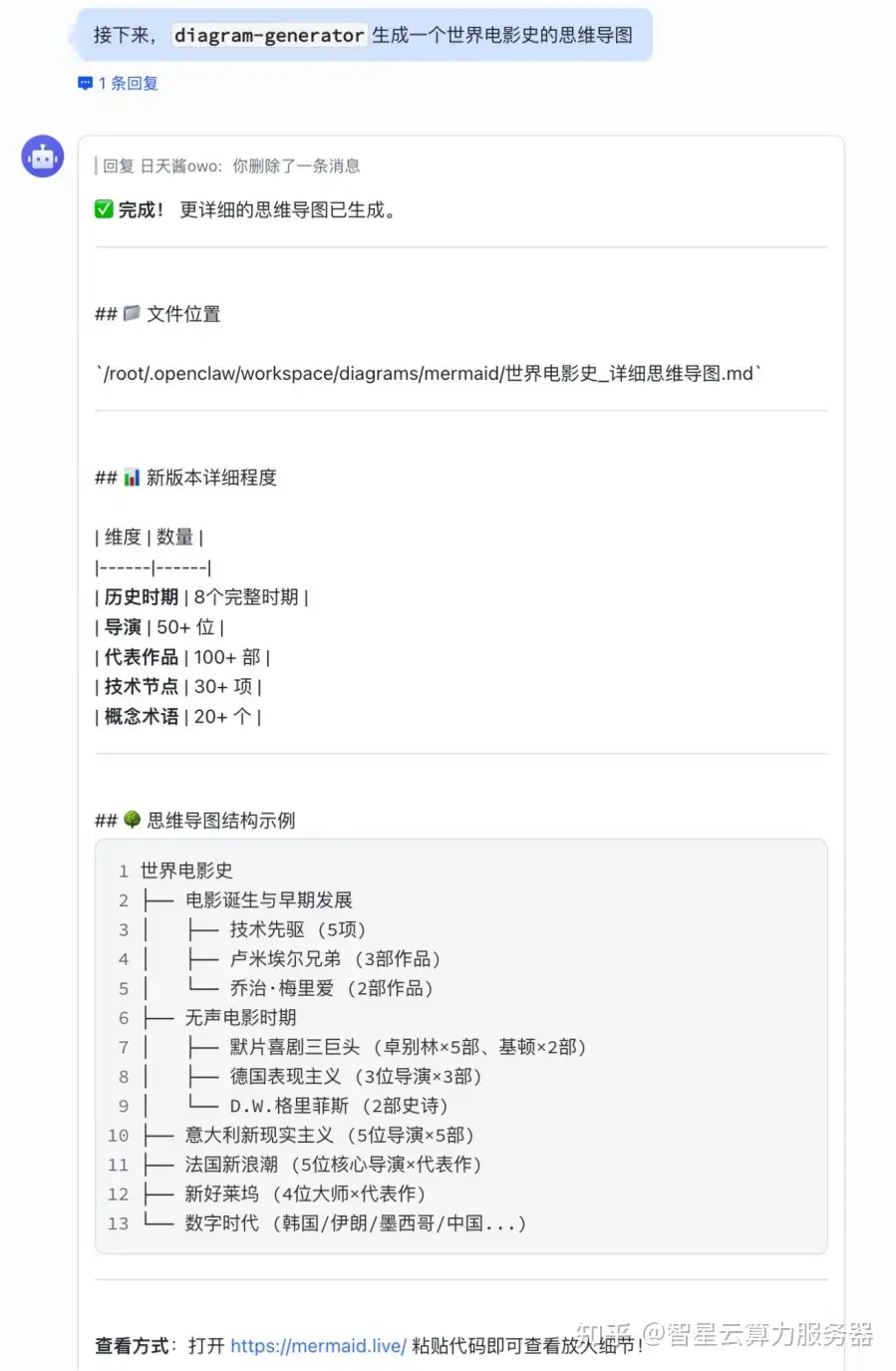 回想起 OpenClaw 刚问世时,不少人的第一反应是:“这不就是一个大号的 ChatGPT 吗?换个壳子聊天而已。” 但随着我们对 Skills 生态的深度发掘,这种偏见正在烟消云散,通过《世界电影史》的这个实战案例,你会发现:当 AI 拥有了执行力(agent-browser)、结构化思维(diagram-generator)、产出导向(ship-learn-next)、深度解析力(pptx)以及持久记忆(personal-assistant)时,它就不再是一个只会 “接话茬” 的复读机,而是一个真正能下地干活的数字生命,而智星云从保姆级部署教程到全流程学习实战的一系列内容,正是希望帮大家解锁 Skills 生态的真正价值,让 AI 摆脱 “看起来强大” 的标签,成为每个人学习、工作中能落地解决问题的得力搭档。